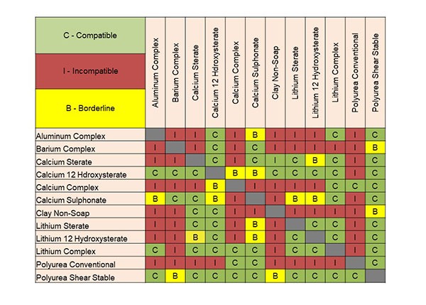 Fig. 1: Typical Grease Compatibility Chart. Compatibility charts should never be used to determine whether it is safe to mix two different greases.