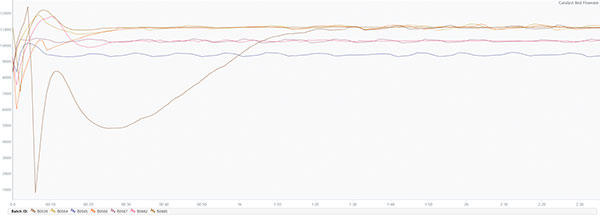 With Seeq’s Capsule Time View, profiles from multiple batches can be overlaid for easy identification of differences in catalyst charge rate. Courtesy Seeq