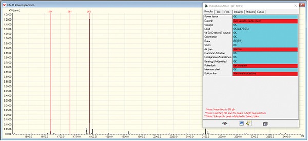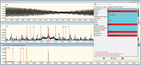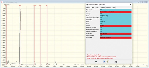 In this example we have a 125-hp, 1,780-rpm electric motor at 75% load and 70 kW input with a current unbalance and high circuit impedance unbalance (loose connection). Some static eccentricity, belt, and belt vibration losses are detected at a total of 1.35 kW static eccentricity losses (Fig. 2) and 1.25 kW belt losses. We will use 6,000 hr./yr. operation at an average of this load, $10/kW demand, and $0.10/kWh.