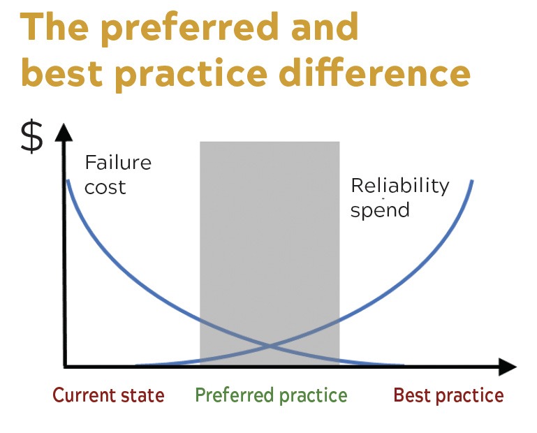 Key to success is recognizing “preferred practices” (Figure 1). Unlike best practices, which often represent an all but unobtainable level of precision that few organizations can afford to deploy, “preferred practice” is the minimum investment required to achieve a certain reliability objective, without incurring excessive spending over and above the benefits that might be realized through improved lubrication.