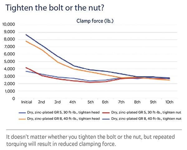 It made little difference whether the nut or the bolt head was tightened. Another observation was that repeated torquing of dry fasteners resulted in significant drop in clamping force. After seven uses, Gr 8 settled to no higher clamping force than Gr 5. This was attributed to the higher torque creating additional damage to the sliding surfaces and thus more resistance to the applied torque.