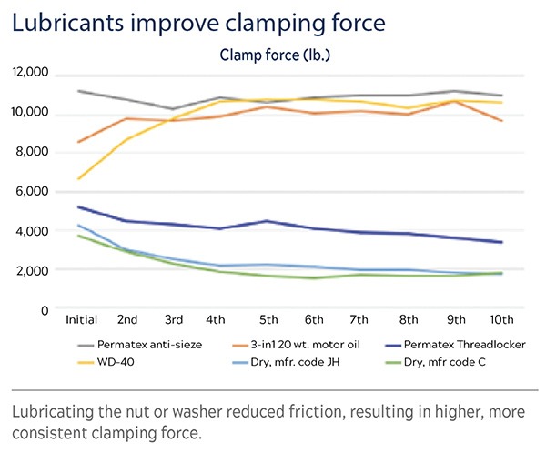 The observation was that most lubricants effectively reduced friction such that much higher and more consistent clamping force was obtained than with dry fasteners. Thread-locking compound did not provide as much lubricating effect.