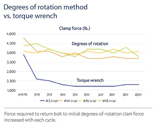 Another test compared the resulting clamping force achieved by the degrees-of-rotation method to that of a torque wrench. In this scenario, the bolt was first torqued to 37 ft.-lb., the degrees-of-rotation noted, then the bolt was loosened and returned to the same degrees nine times. All tightening was performed with dry 3/8-in.-16 zinc-plated Gr 8 fasteners.